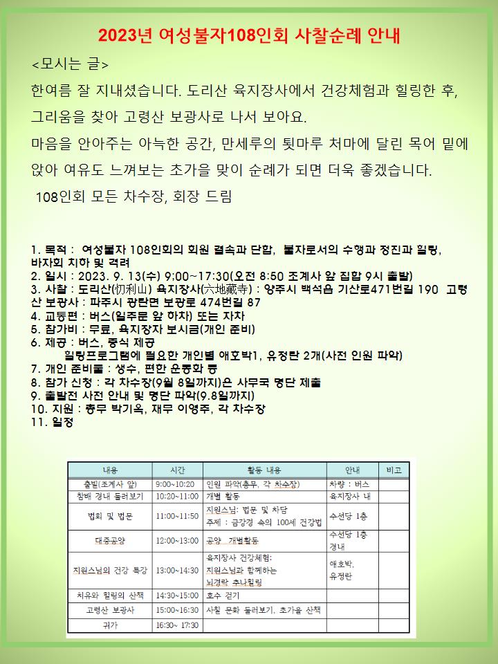 2. ÀϽà : 2023. 9. 13(¼ö) 9;00~17:30(¿ÀÀü 8:50 Á¶°è»ç ¾Õ ÁýÇÕ 9½Ã Ãâ¹ß)