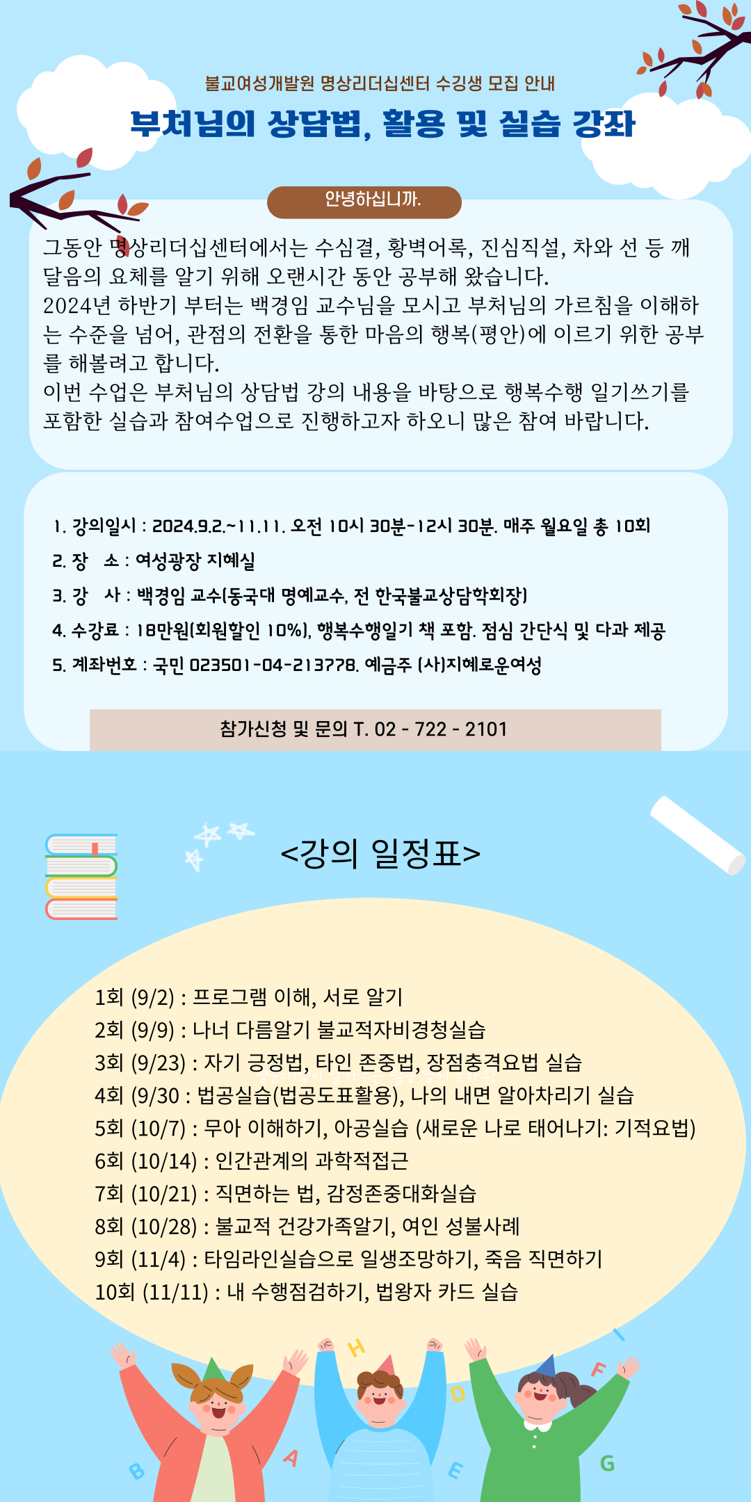 ºÎó´ÔÀÇ »ó´ã¹ý, Ȱ¿ë ¹× ½Ç½À °­Á ¼ö°­»ý ¸ðÁý ¾È³»(¸í»ó¸®´õ½Ê¼¾ÅÍ)   2024-08-17 (Åä) 19:13