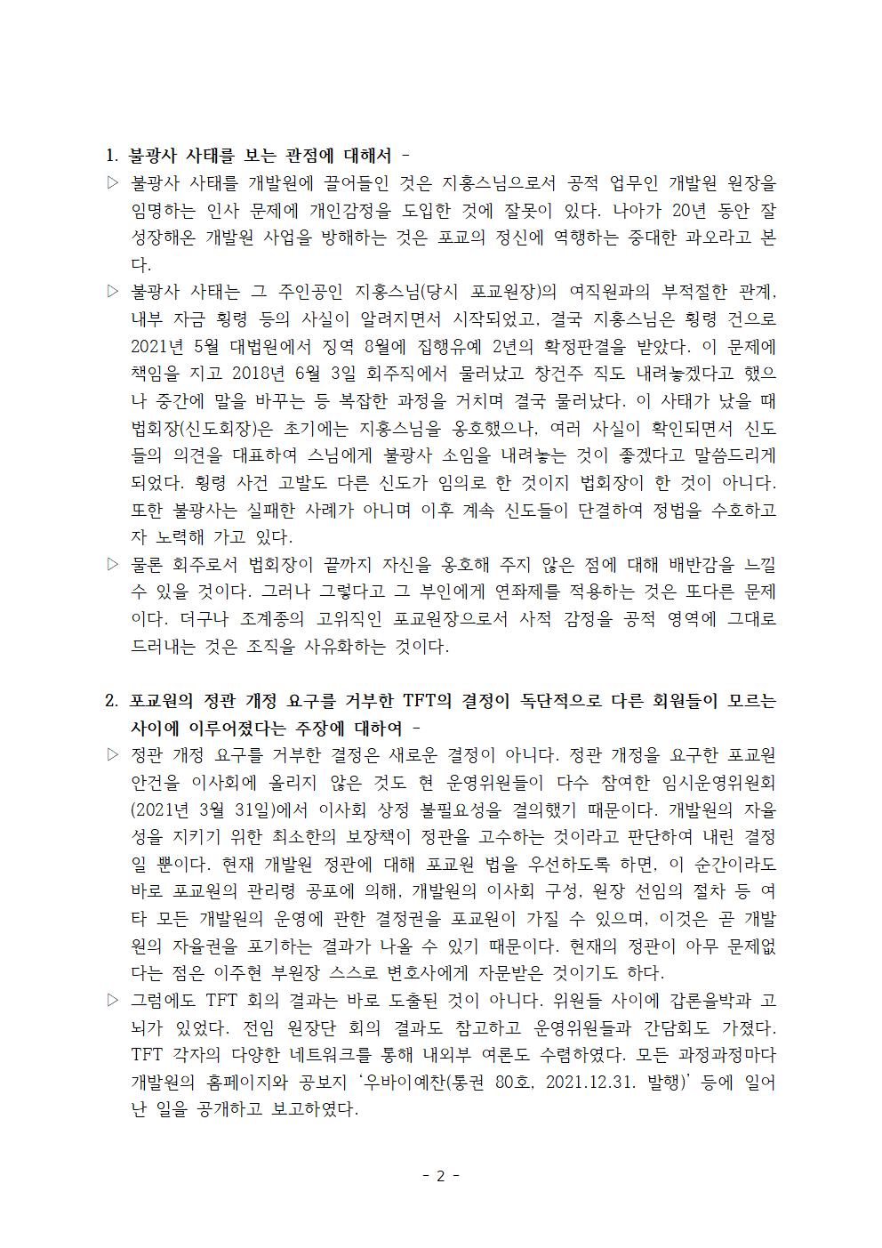 2021 6. 9 ¿ÀÈÄ 2½Ã ºÒ±³¿©¼º°³¹ß¿ø À̻簣´ãȸ¿¡¼ Æ÷±³¿ø Çö¾È ÇØ°áÀ» À§ÇÑ TFT(ÀÌÈÄ ºñ´ëÀ§_ ºñ»ó´ëÃ¥À§¿øÈ¸) ¹ßÁ·ÇÏ°í ±× ÀÏ¿øÀÎ ÀÌÁÖÇö ºÎ¿øÀåÀÌ 2022.1.18(È) ¿ÀÈÄ 4½Ã 30ºÐ¿¡±âÀÚȸ°ßÀ» ÀÚûÇÑ ³»¿ë¿¡ ´ëÇØ ºñ´ëÀ§ÀÇ ÀÔÀå¹®À» ¿Ã¸³´Ï´Ù.