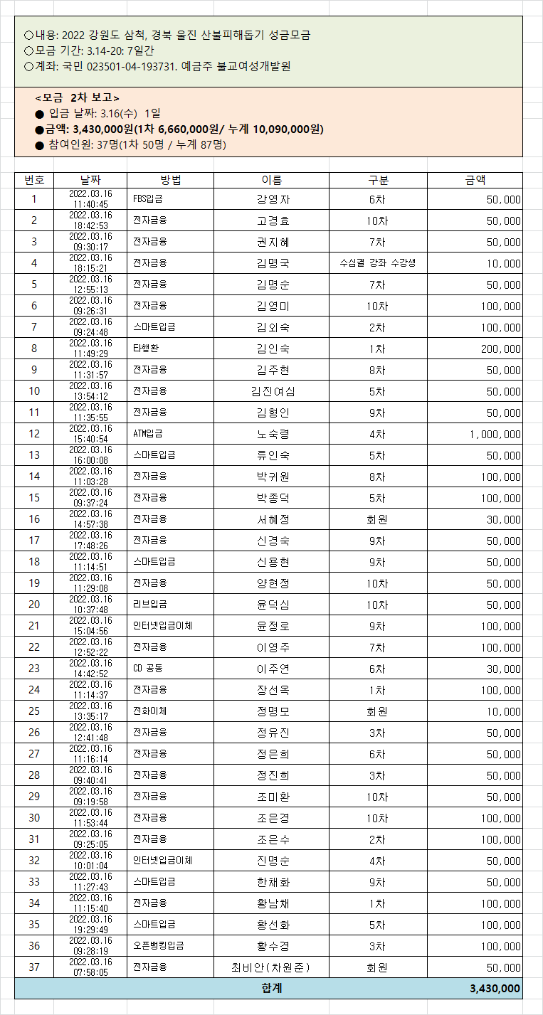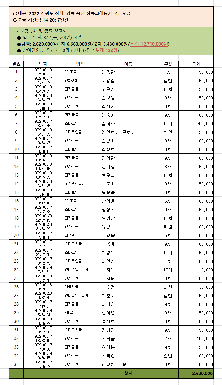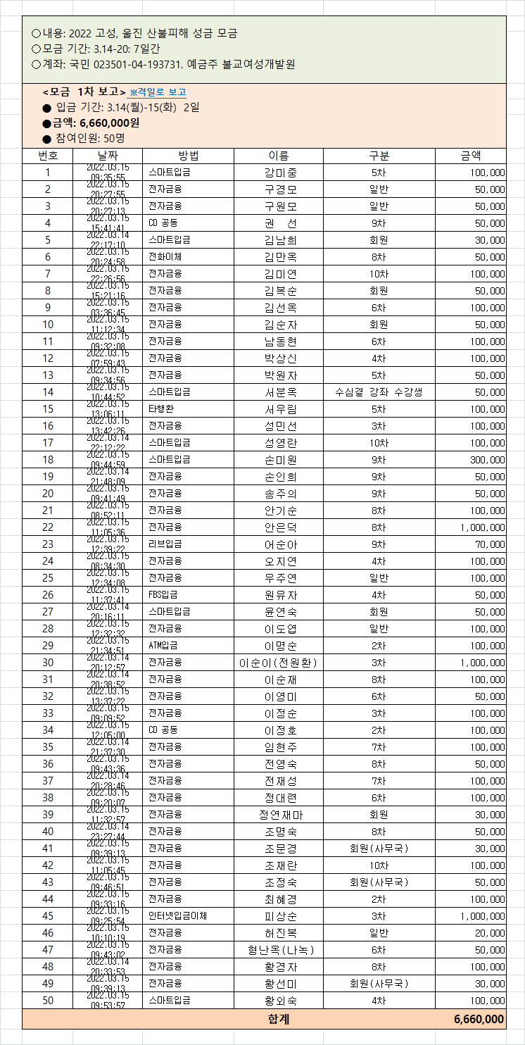 ºÒ±³¿©¼º°³¹ß¿ø¿¡¼´Â Áö³ 3¿ù 4ÀϺÎÅÍ ½ÃÀÛµÈ °¿øµµ °í¼º, ¿ïÁø »êºÒ ÇÇÇØ ¼Ò½ÄÀ» µè°í ÇÏ·ç¾ÆÄ§¿¡ ȸ¶¸¦ ´çÇØ ¾È½Äó¸¦ ÀÒÀº ºÐµéÀ» À§ÇØ ¼º±ÝÀ» ¸ðÀ¸°íÀÚ ÇÕ´Ï´Ù.