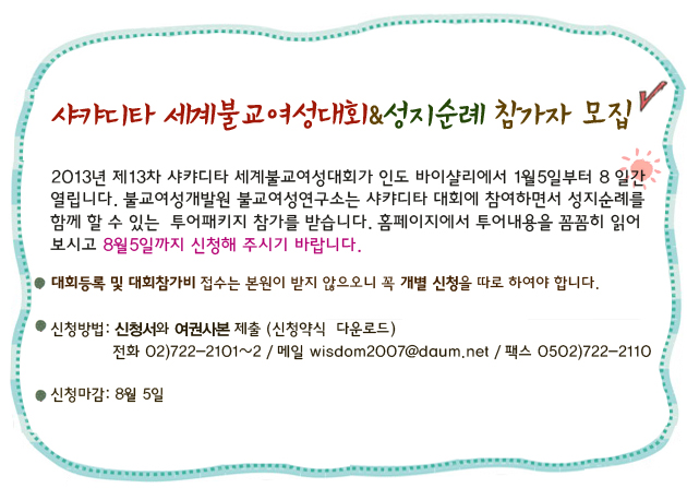 Á¦ 13Â÷ »þļµðŸ ¼¼°èºÒ±³¿©¼º´ëȸ&Àεµ¼ºÁö¼ø·Ê Âü°¡ÀÚ¸ðÁý(8.5±îÁö)   2012-07-27 (±Ý) 18:46