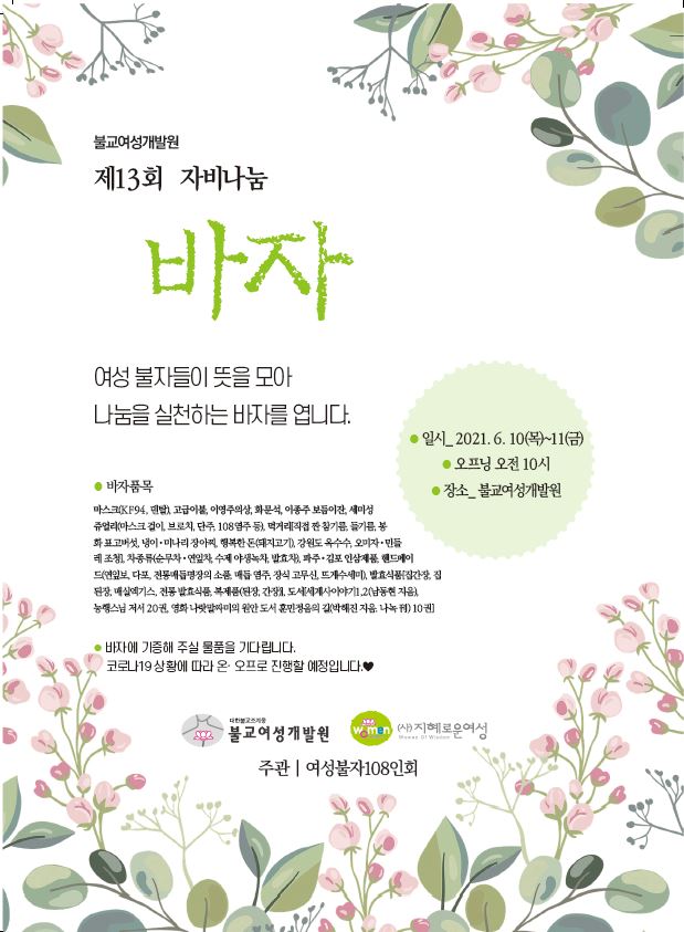 ºÒ±³¿©¼º°³¹ß¿ø ¿©¼ººÒÀÚ108ÀÎȸ ÁÖ°üÀ¸·Î Á¦ 13Â÷ ÀÚºñ³ª´® ¹ÙÀÚ¸¦ °³ÃÖÇÕ´Ï´Ù.