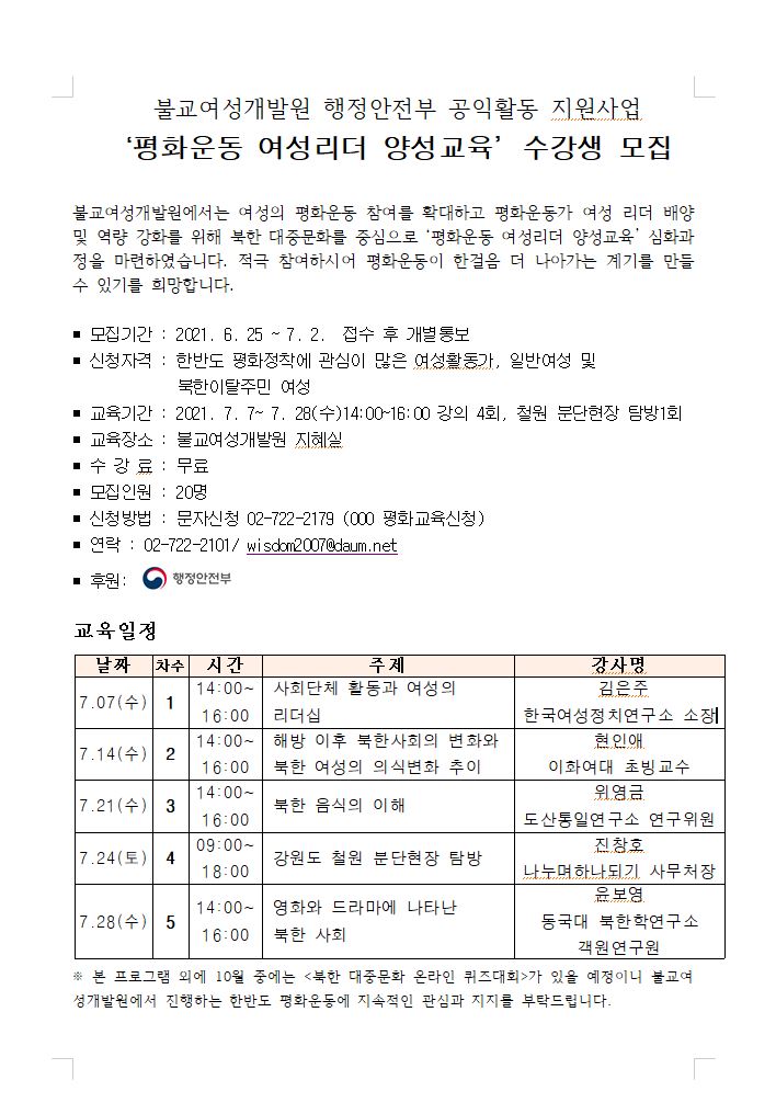ÇàÁ¤¾ÈÀüºÎ °øÀÍȰµ¿ Áö¿ø»ç¾÷ ¡®ÆòÈ­¿îµ¿ ¿©¼º¸®´õ ¾ç¼º±³À°¡¯¼ö°­»ý ¸ðÁý   2021-06-25 (±Ý) 14:43