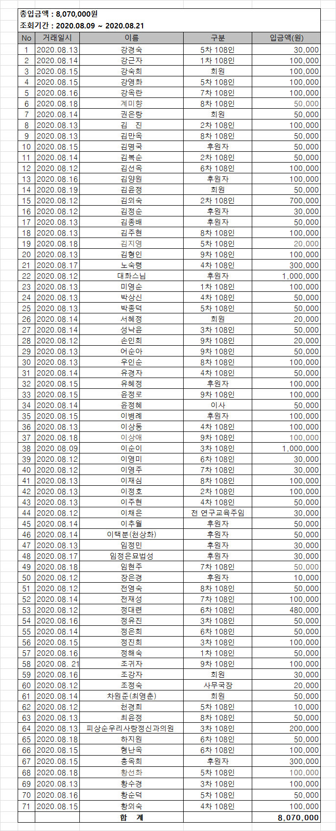 8.18(È) 2½Ã¿¡ ´ëÇѺұ³Á¶°èÁ¾ »çȸº¹ÁöÀç´Ü »óÀÓÀÌ»ç º¸ÀϽº´Ô, »ç¹«Ã³Àå ź¿õ½º´Ô, »ç¹«±¹Àå ´ÉÇнº´ÔÀ» ºË°í ¼öÇØÇÇÇØ ¼º±Ý 71¸íÀÌ Âü¿©ÇÏ¿© µÎÂ÷·Ê¿¡ °ÉÃÄ 807¸¸¿øÀ» Àß Àü´ÞÇÏ¿´½À´Ï´Ù.