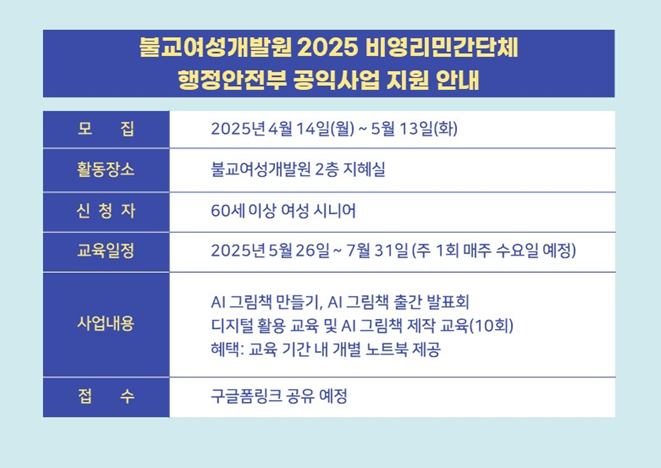 ºÒ±³¿©¼º°³¹ß¿ø 2025 ºñ¿µ¸®¹Î°£´Üü ÇàÁ¤¾ÈÀüºÎ °øÀÍ»ç¾÷ Áö¿ø ¾È³» |