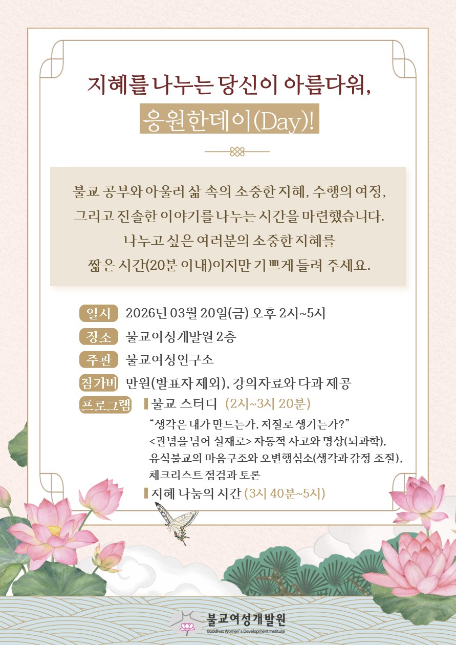 3¿ù 20ÀÏ(±Ý) ºÒ±³¿©¼º¿¬±¸¼ÒÀÇ ¡°ÁöÇý¸¦ ³ª´©´Â ´ç½ÅÀÌ ¾Æ¸§´Ù¿ö, ÀÀ¿øÇѵ¥ÀÌ!¡± 4Â÷ Çà»ç°¡ ¿¸³´Ï´Ù.