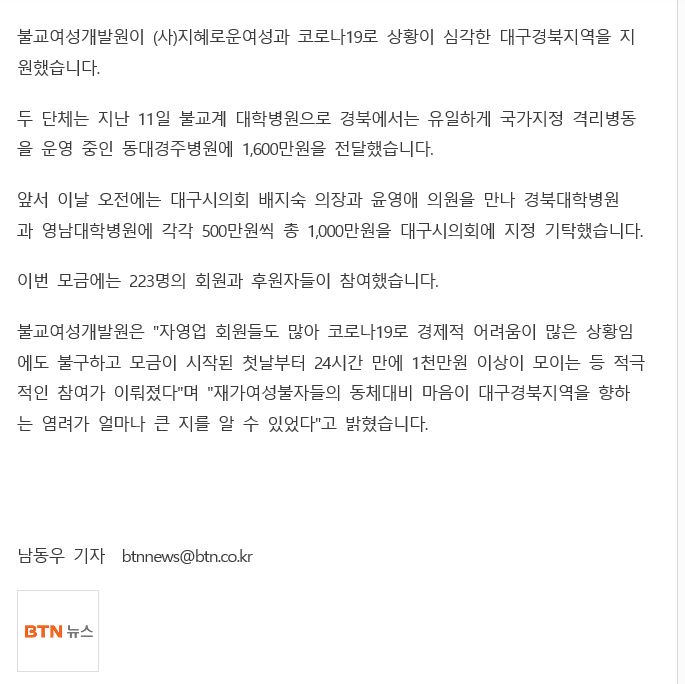 BTNºÒ±³TV ºÒ±³¿©¼º°³¹ß¿ø, ´ë±¸°æºÏÁö¿ª¿¡ 2600¸¸ ¿ø Áö¿ø