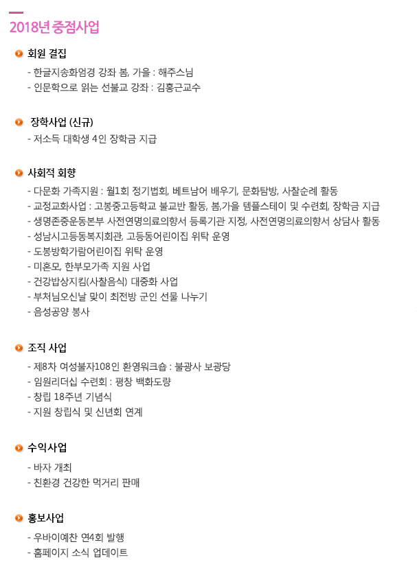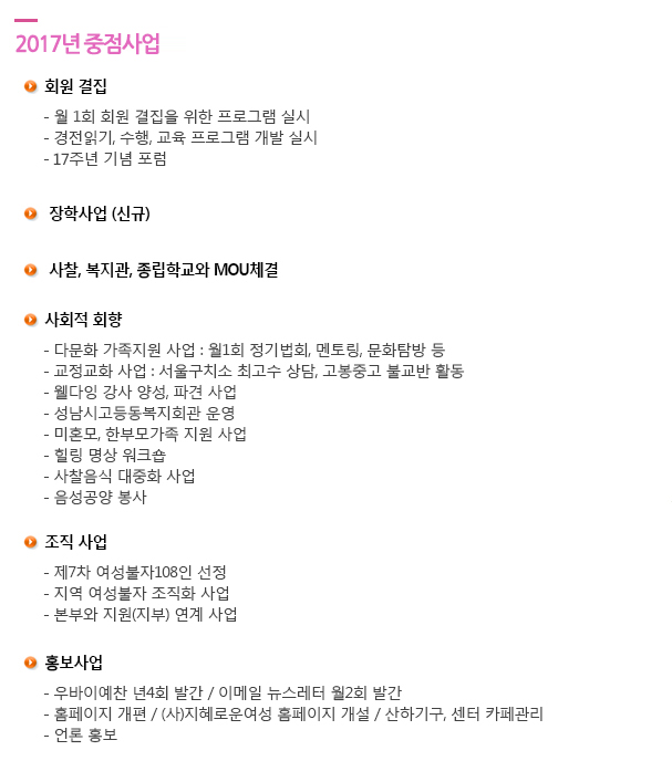 | ¿¬´ë»ç¾÷ | 1. ¼ºÆòµîºÒ±³¿¬´ë 2. ºÒ±³±âÈÄÇൿ 3.¼¿ï½ÃÇѺθð°¡Á·Áö¿ø¼¾ÅÍ 4. 6.15¿©¼ºº»ºÎ |